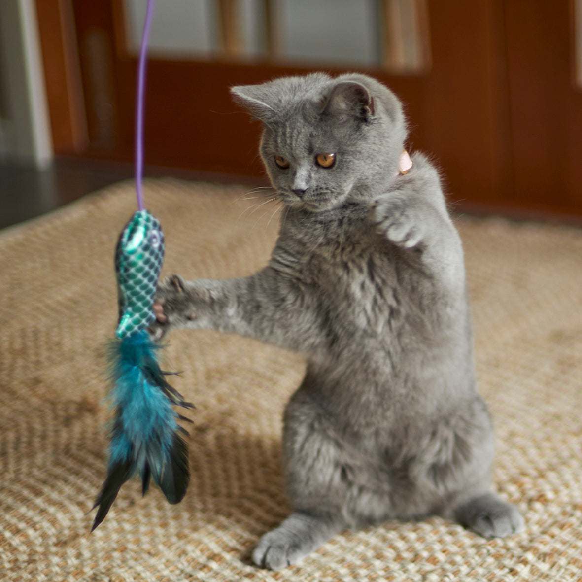 - Long, flexible plastic rod with a springy elastic rope, a colourful ball and a fabric fishy with a feathery tail