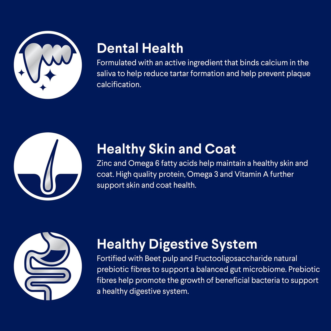 Designed for adult dogs of all breeds and sizes, it features a unique dental health formula to help reduce tartar build-up, natural prebiotic fibres for healthy digestion, and added omega fatty acids and zinc to promote healthy skin and a shiny coat. Made with carefully selected ingredients and no artificial colours, flavours, wheat, whole corn, soy, or beef, it’s nutrition you can trust every day.