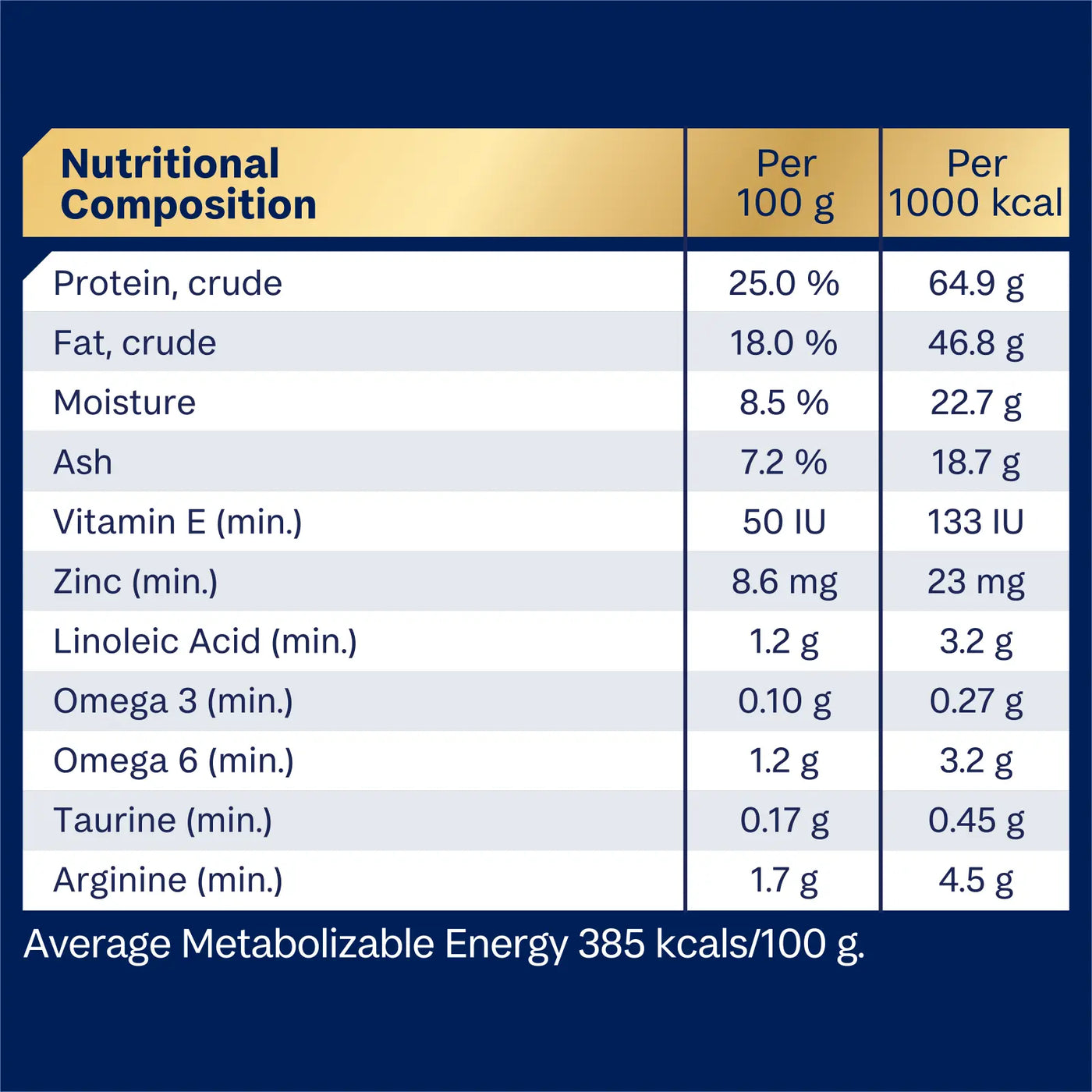 Turkey Meal, Rice, Sorghum, Rice Flour, Chicken Fat, Chicken Meal, Natural Chicken Flavour, Dried Beet Pulp, Vitamins & Minerals, Salt, Amino Acids (including Arginine, Methionine & Taurine), Fish Oil, Inulin, Antioxidants, Sodium Tripolyphosphate.