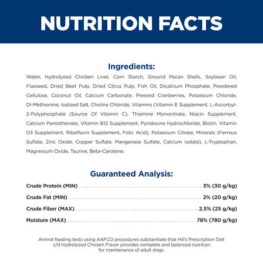 Hill’s Prescription Diet z/d Hydrolysed Wet Dog Food is a highly digestible, great-tasting clinical nutrition formulated to help avoid skin and digestive signs of adverse food reactions in dogs. Made without additives known to cause food allergies. Its high digestibility supports easy nutrient absorption and meets the nutritional needs of adult dogs.