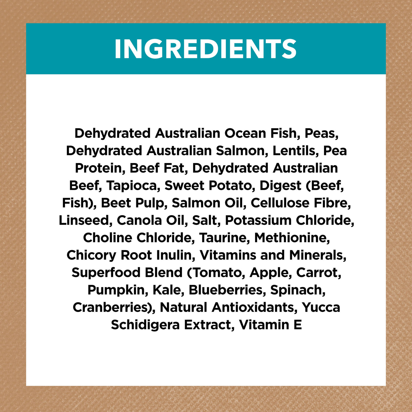 - Dehydrated Australian ocean fish, peas, dehydrated Australian salmon, lentils, pea protein, beef fat, dehydrated Australian beef, tapioca, sweet potato, digest (beef, fish), beet pulp, salmon oil, cellulose fibre, linseed, canola oil, salt, potassium chloride, choline chloride, taurine, methionine, chicory root inulin, vitamins and minerals, superfood blend (tomato, apple, carrot, pumpkin, kale, blueberries, spinach, cranberries), natural antioxidants, yucca schidigera extract and vitamin E