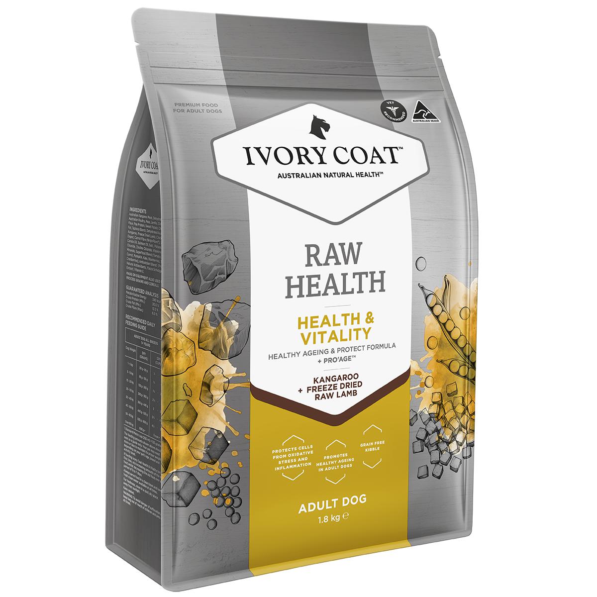 - Ivory Coat Raw Health Adult Dog Longevity Dry Food with Freeze Dried Kangaroo Pieces 1.8kg