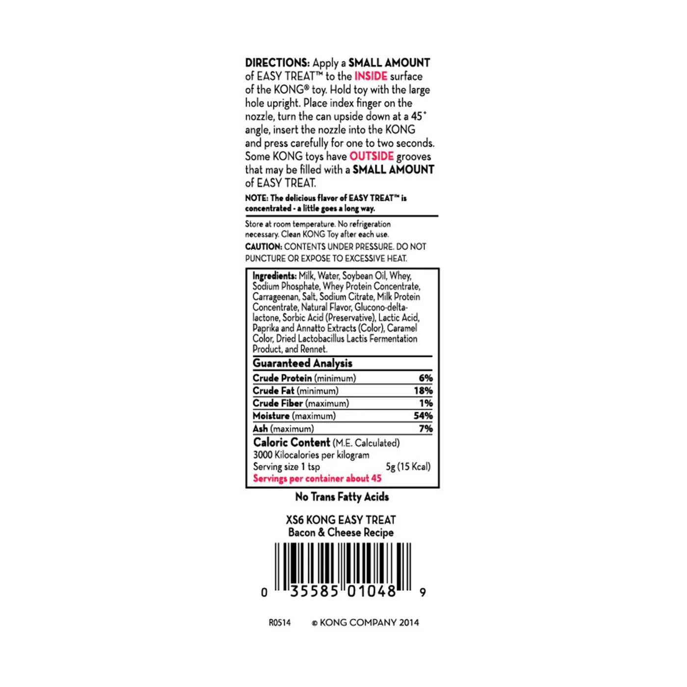 Crafted in the USA, KONG Bacon and Cheese Easy Treat™ offers a delectable treat that satisfies all breeds of dogs, presenting a clean and hassle-free option for pet owners. This treat is highly digestible, free of trans-fat, and pairs perfectly with a stuffed KONG. Its uniquely designed nozzle ensures precise control over the amount dispensed, doubling as a convenient, mess-free stuffing solution.