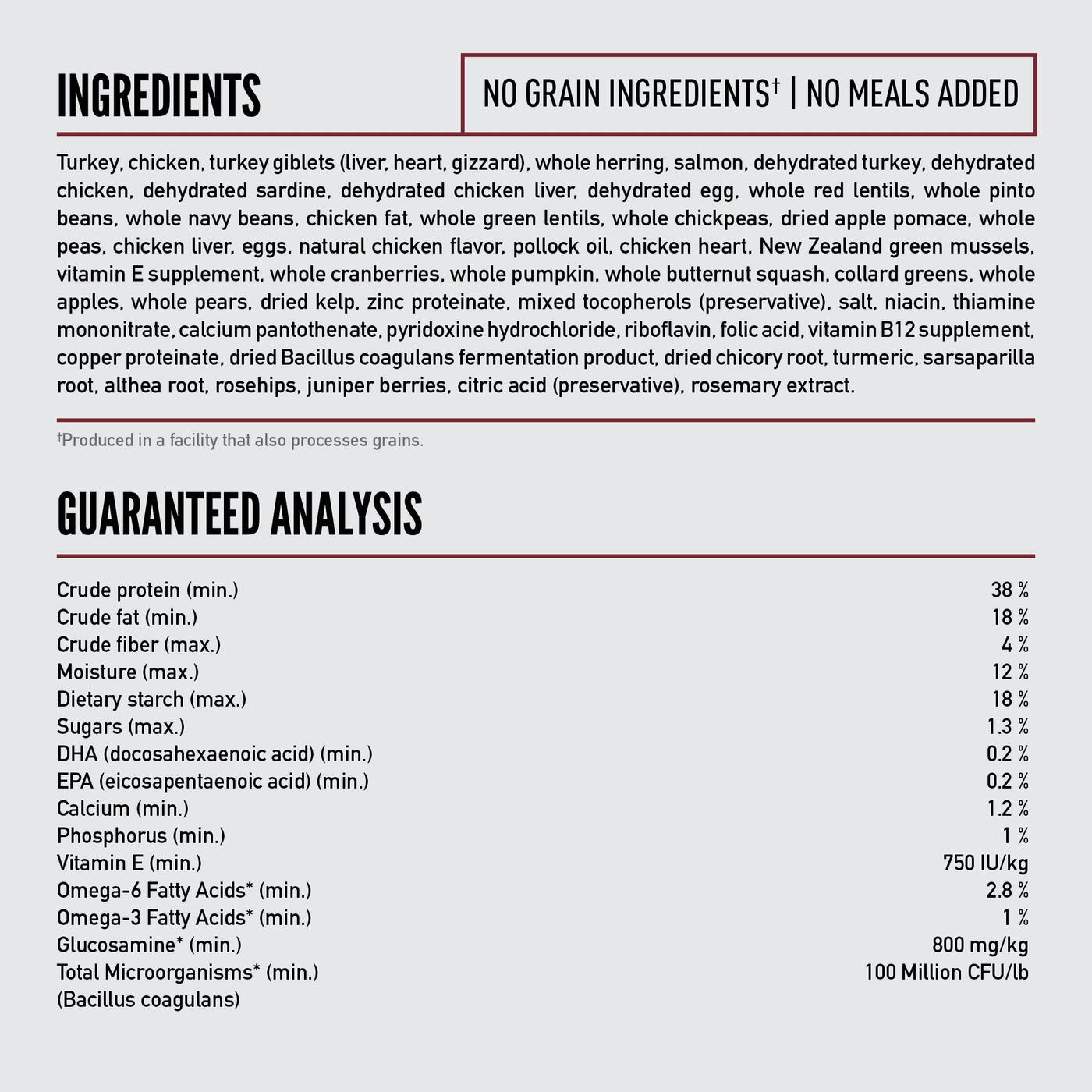 - Turkey, chicken, turkey giblets (liver, heart, gizzard), whole herring, salmon, dehydrated turkey, dehydrated chicken, dehydrated sardine, dehydrated chicken liver, dehydrated egg, whole red lentils, whole pinto beans, whole navy beans, chicken fat, whole green lentils, whole chickpeas, dried apple pomace, whole peas, chicken liver, eggs, natural chicken flavour, pollock oil, chicken heart, New Zealand green mussels, vitamin E supplement, whole cranberries, whole pumpkin, whole butternut squash, collard greens, whole apples, whole pears, dried kelp, zinc proteinate, mixed tocopherols (preservative), salt, niacin, thiamine mononitrate, calcium pantothenate, pyridoxine hydrochloride, riboflavin, folic acid, vitamin B12 supplement, copper proteinate, dried Bacillus coagulans fermentation product, dried chicory root, turmeric, sarsaparilla root, althea root, rosehips, juniper berries, citric acid (preservative), rosemary extract.