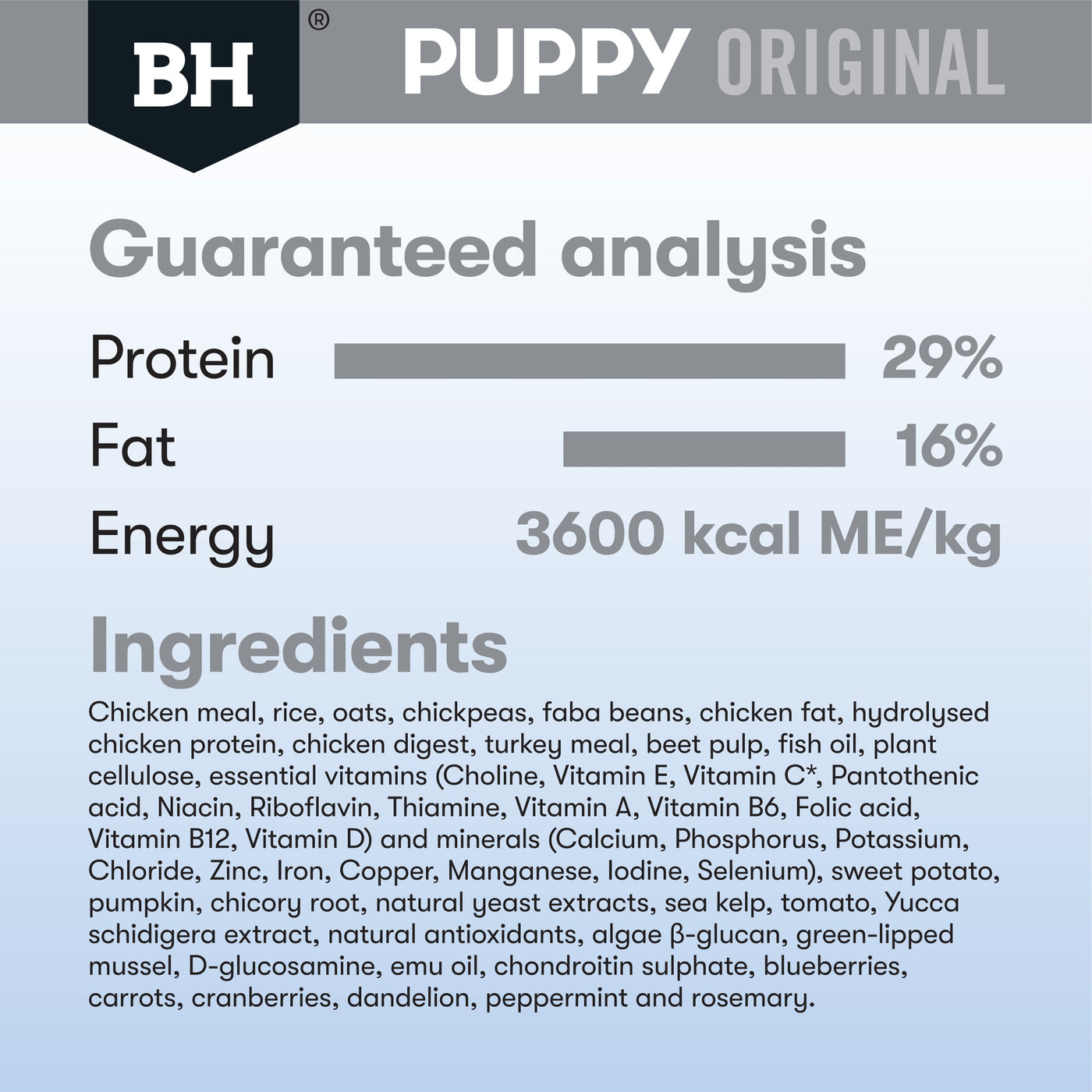 - Chicken meal, rice, oats, chickpeas, faba beans, chicken fat, hydrolysed chicken protein, chicken digest, turkey meal, beet pulp, fish oil, plant cellulose, essential vitamins and minerals, sweet potato, pumpkin, chicory root, natural yeast extracts, sea kelp, tomato, Yucca schidigera extract, natural antioxidants, algae β-glucan, green-lipped mussel, D-glucosamine, emu oil, chondroitin sulphate, blueberries, carrots, cranberries, dandelion, peppermint and rosemary
