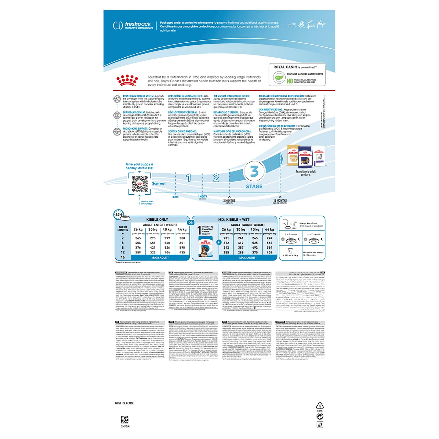 - Puppies’ immune systems develop gradually. Maxi Puppy is made with vitamin E and antioxidants to boost their natural defences as your puppy grows