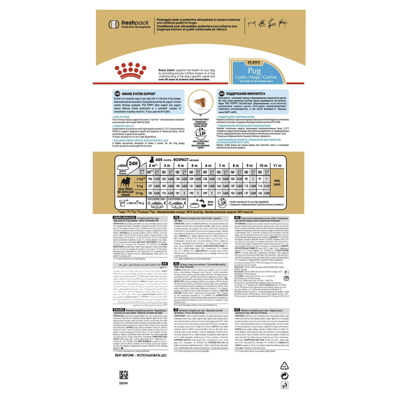 - The texture, size and shape of each kibble piece is designed specifically to appeal to Pug puppies. It's easy for them to eat, and encourages them to chew their food properly before they swallow