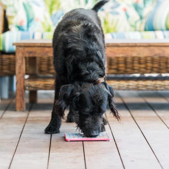 - Spread wet food on the LickiMat's textured surface, or sprinkle it with treats or dry food, forcing your dog to take time to lick the LickiMat to get to food that's stuck in the grooves