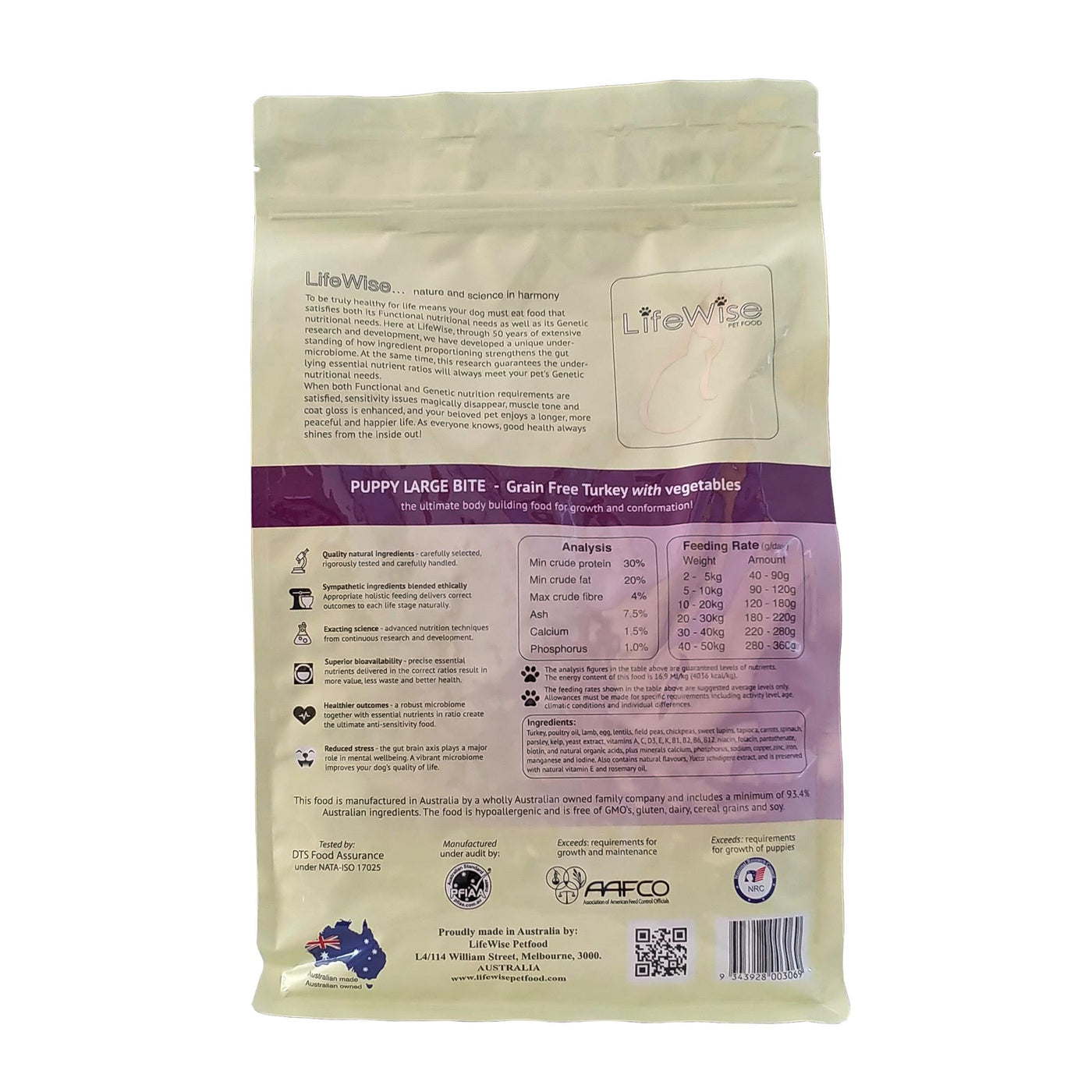 - LifeWise Grain Free Turkey with Lamb Large Bites for Puppies is a balanced recipe that's designed specifically to suit the unique dietary needs of large breed puppies in their third stage of growth. The kibble pieces are larger, so they're more filling for big dogs