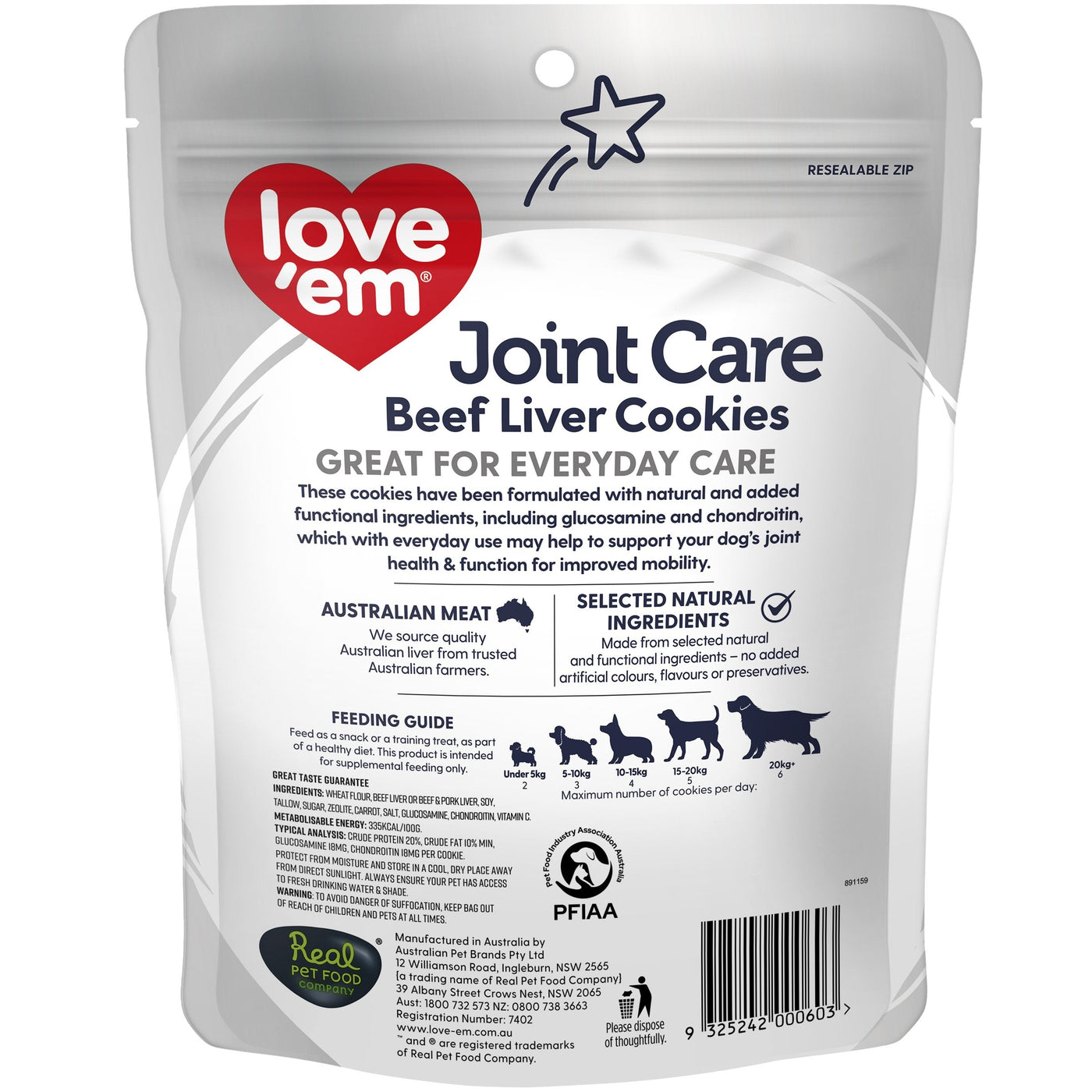 Love 'Em's Joint Care Beef Liver Cookies are tasty treats that are really good for your dog's joints! Senior dogs, as well as large breed dogs often experience joint stiffness and pain. These cookies contain chondroitin and glucosamine, which help improve your dog's joint function.