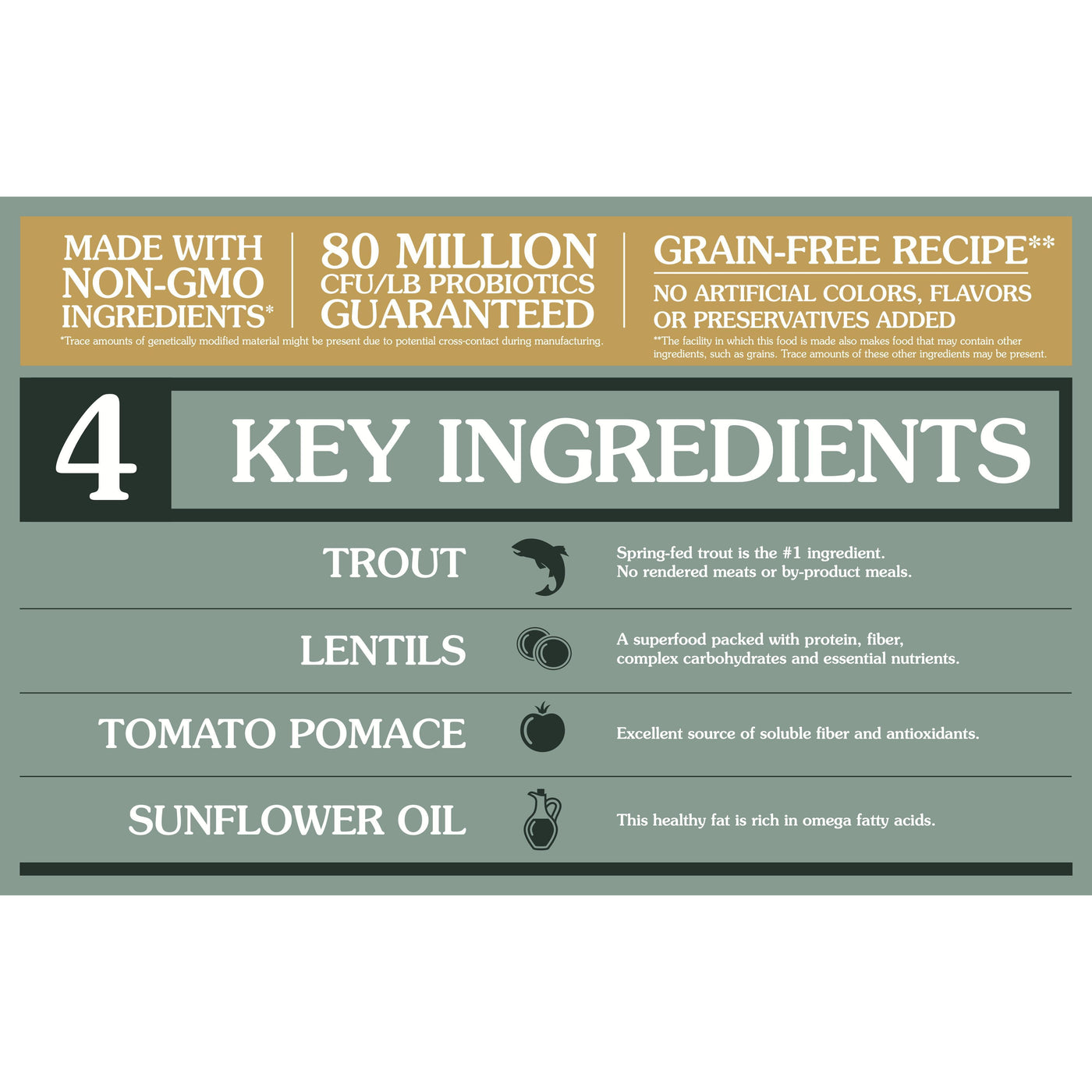 - Trout, lentils, tomato pomace, sunflower oil (preserved with mixed tocopherols), natural flavour, dicalcium phosphate, calcium carbonate, salmon oil (source of DHA), salt, DL-Methionine, choline chloride, taurine, L-Carnitine, dried Lactobacillus plantarum fermentation product, dried Bacillus subtilis fermentation product, dried Lactobacillus acidophilus fermentation product, dried Enterococcus faecium fermentation product, dried Bifidobacterium animalis fermentation product, vitamin E supplement, iron proteinate, zinc proteinate, copper proteinate, ferrous sulphate, zinc sulphate, copper sulphate, potassium iodide, thiamine mononitrate, manganese proteinate, manganous oxide, ascorbic acid, vitamin A supplement, biotin, niacin, calcium pantothenate, manganese sulphate, sodium selenite, pyridoxine hydrochloride, vitamin B12 supplement, riboflavin, vitamin D3 supplement and folic acid. Contains a source of live (viable), naturally occurring microorganisms