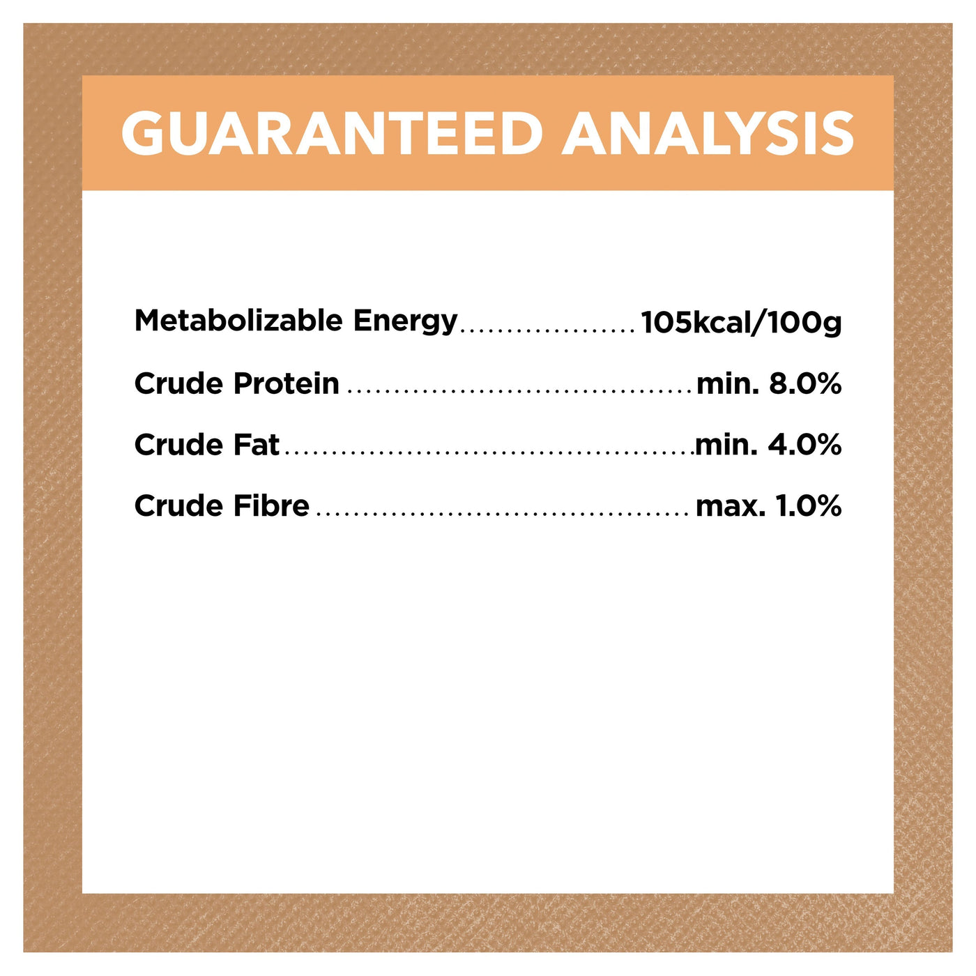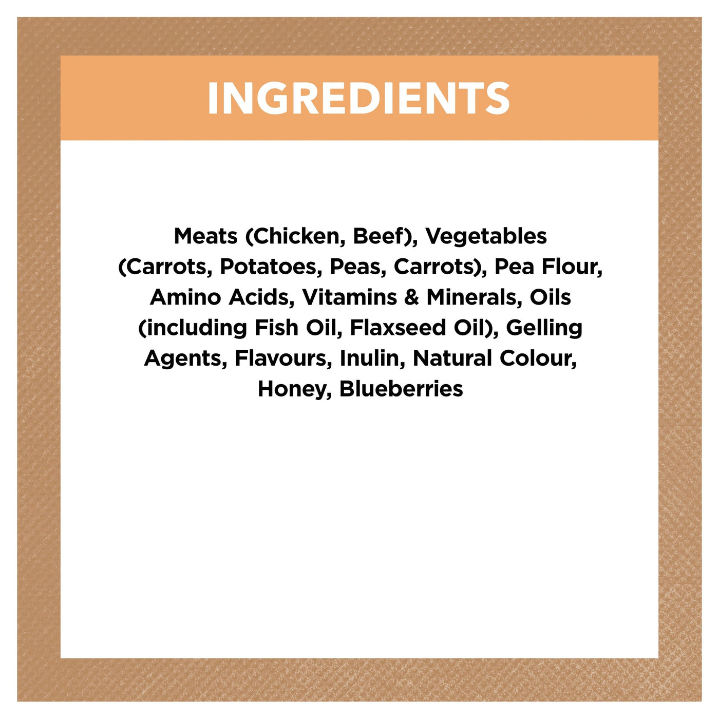- Meats (chicken, beef), vegetables (sweet potato, peas, carrots), pea flour, amino acids, vitamins and minerals, oils (including fish oil, flaxseed oil), gelling agents, flavours, inulin, natural colour, honey and blueberries