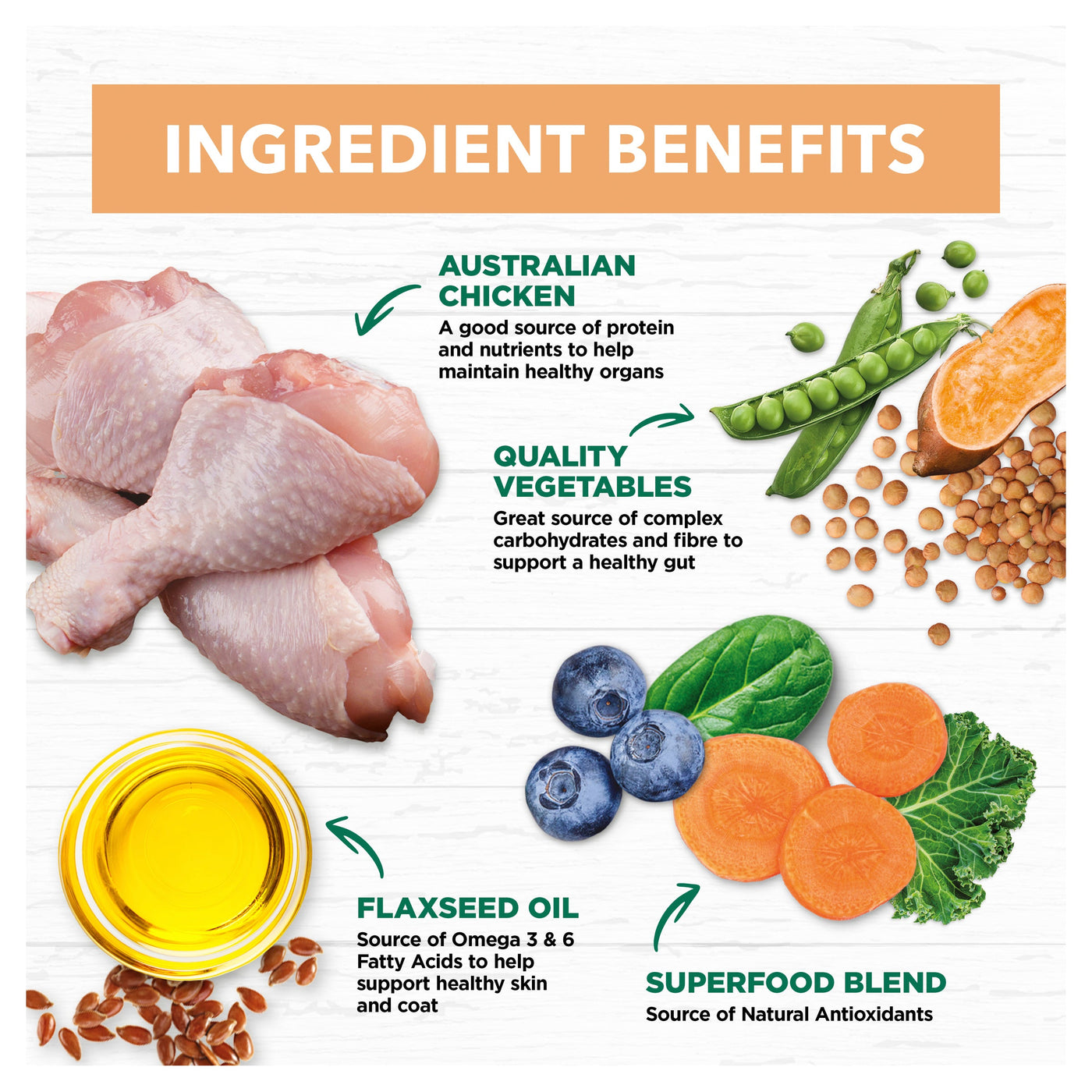 - Grain free recipe contains no wheat, corn, rice, soy or artificial colours, flavours or preservatives