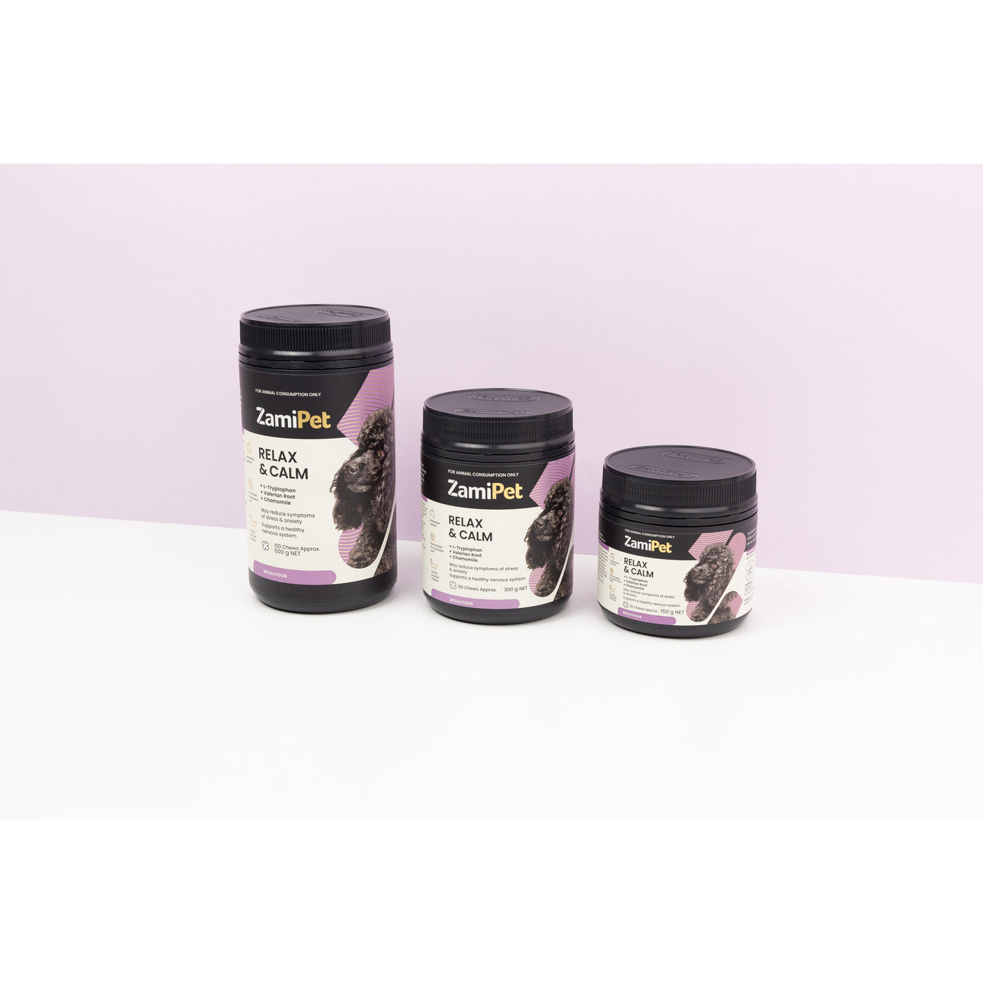 With ZamiPet's Relax and Calm Chews around, anxious dogs can beathe a sign of relief These amazing chews are made with all-natural ingredients like valerian root and chamomile to help keep anxious dogs calm and happy, without making them drowsy. Made in Australia Developed by Australian vets Made with real, locally sourced chicken Chews designe...