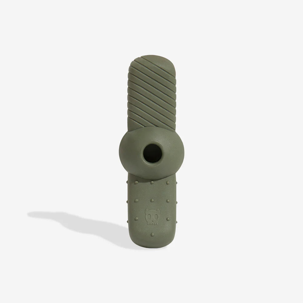 - Bacon-scented chew toy with a textured surface that helps keep dogs' teeth clean