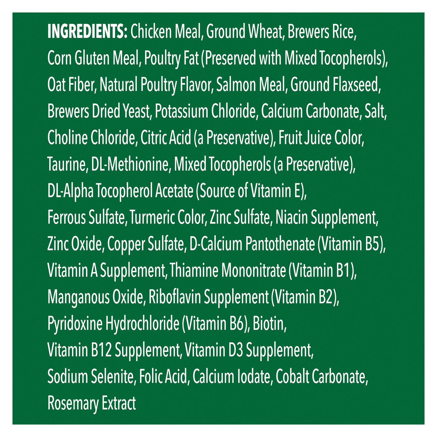 - Chicken meal, ground wheat, brewers rice, corn gluten meal, poultry fat (preserved with mixed tocopherols), oat fibre, natural poultry flavour, salmon meal, ground flaxseed, brewer's dried yeast, potassium chloride, calcium carbonate, salt, choline chloride, citric acid (a preservative), fruit juice colour, taurine, DL-methionine, mixed tocopherols (a preservative), DL-alpha tocopherol acetate (source of vitamin E), ferrous sulphate, turmeric colour, zinc sulphate, niacin supplement, zinc oxide, copper sulphate, D-calcium pantothenate (vitamin B5), vitamin A supplement, thiamine mononitrate (vitamin B1), manganous oxide, riboflavin supplement (vitamin B2), pyridoxine hydrochloride (vitamin B6), biotin, vitamin B12 supplement, vitamin D3 supplement, sodium selenite, folic acid, calcium iodate, cobalt carbonate and rosemary extract